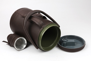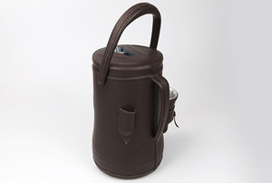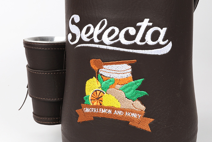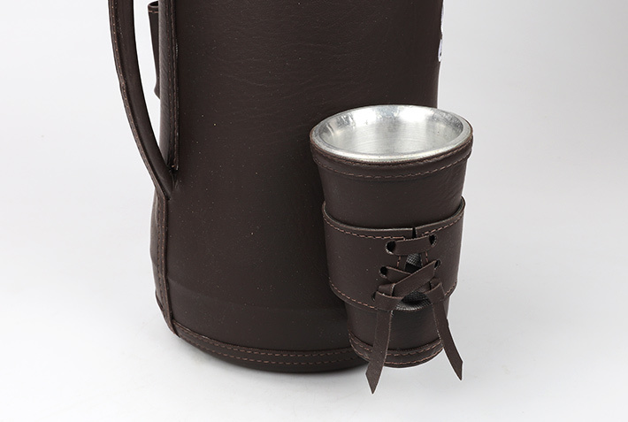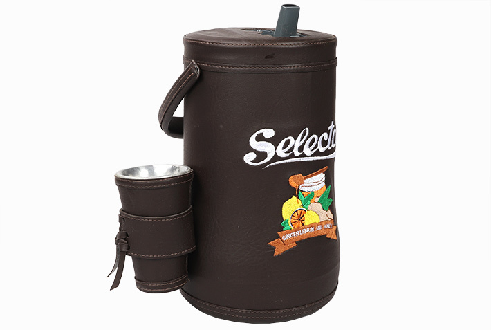 Termon jest cały obity skórą ekologiczną w kolorze ciemno-brązowym. Ozdobiony haftowanym logiem yerbowej marki Selecta.