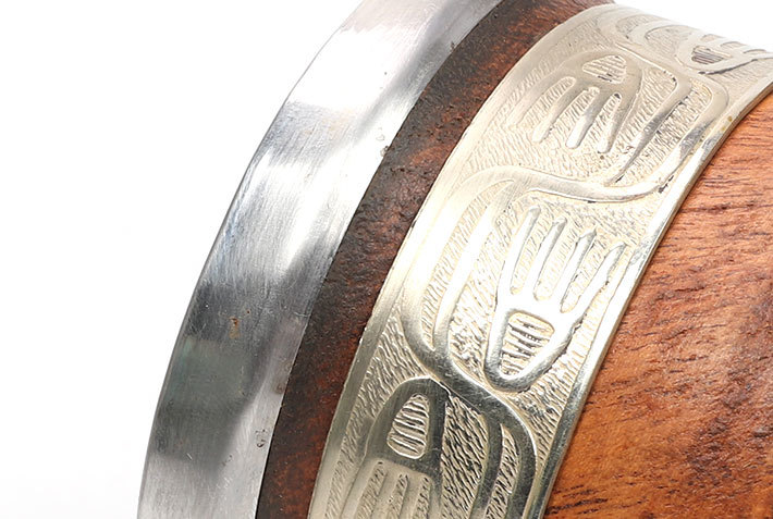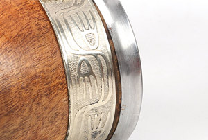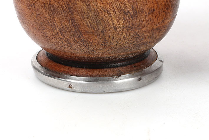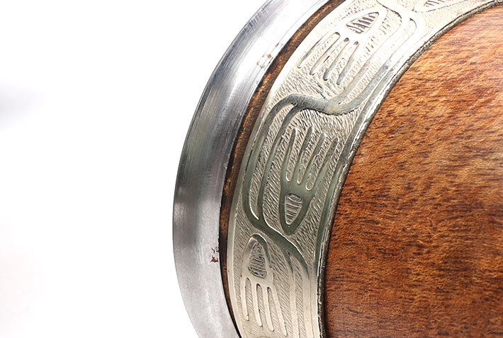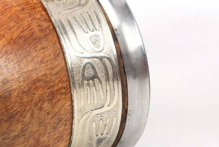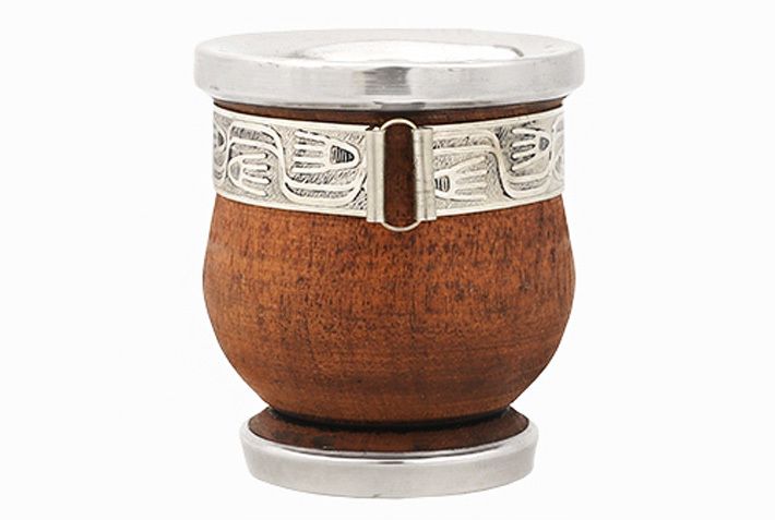 Argentyńskie naczynie z popularnego w Argentynie drewna algarrobo ozdobionego grawerowaną opaską z pięknego stopu alpaki (tzw. nowe srebro) oraz wirolą z INOXu, w zestawie z bombillą.