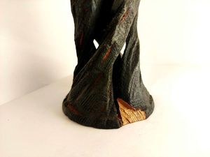 Naczynie stoi stabilnie na rzeźbionej, wysokiej nóżce. Jest wykonane z jednego kawałka drewna algarrobo. Mistrzowskie dzieło.