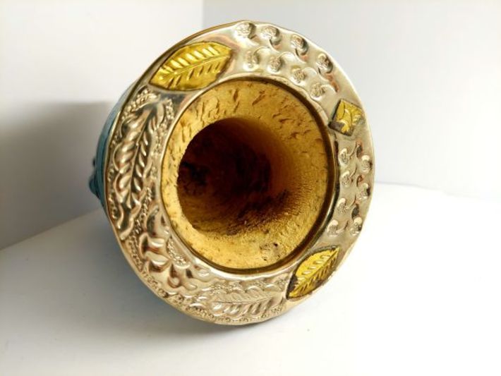 Obniżka ze względu na drobne, miejscowe naloty na zdobieniach z brązu (widoczne na zdjęciach). Celem sprawdzenia szczelności do tykwy została wlana woda, dlatego na ściankach uwidoczniły się bardziej naturalne przebarwienia, charakterystyczne dla naczyń z owocu tykwy. Pięknie się prezentuje a pojemność jest idealna dla osób które preferują mniejsze naczynia.