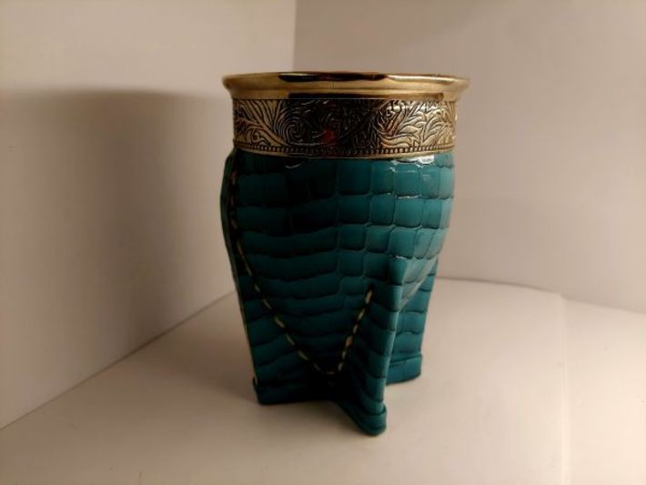 Unikatowe naczynie wytworzone w Argentynie z dużego egzemplarza owocu tykwy o grubych ściankach. Całość obita lakierowaną skórą w granatowym kolorze.