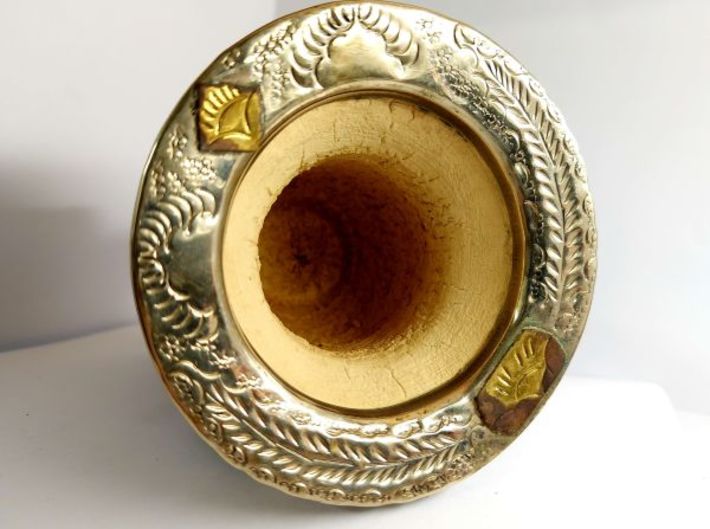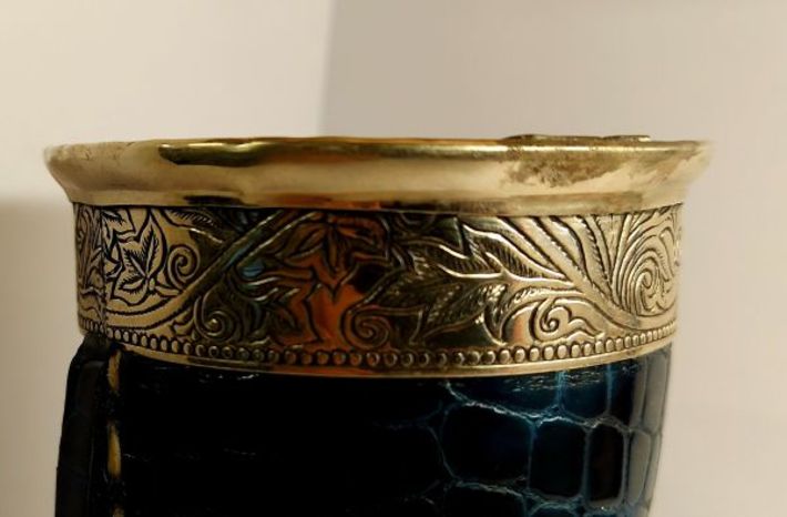 Okucie u góry (wirola) wykonano z alpaki (stop metali zwany "nowym srebrem" o podobnych do srebra właściwościach), ręcznie grawerowanej.