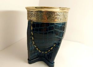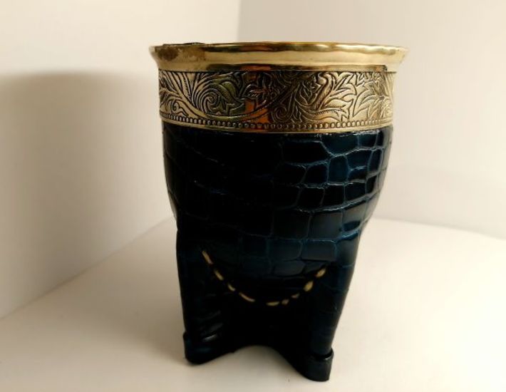 Unikatowe naczynie wytworzone w Argentynie z dużego egzemplarza owocu tykwy o grubych ściankach. Całość obita lakierowaną skórą w granatowym kolorze.