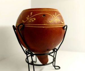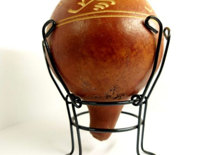 Klasyczna, urugwajska tykwa umieszczona na metalowym stojaczku zapewniającym stabilność.