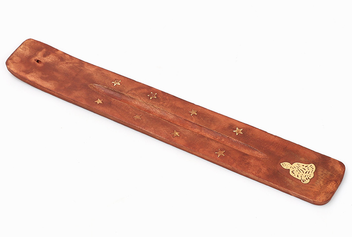 Klasyczna, drewniana podstawka na kadzidełka w formie patyczków. Posiada ozdobny, metalowy element w kształcie Buddy.