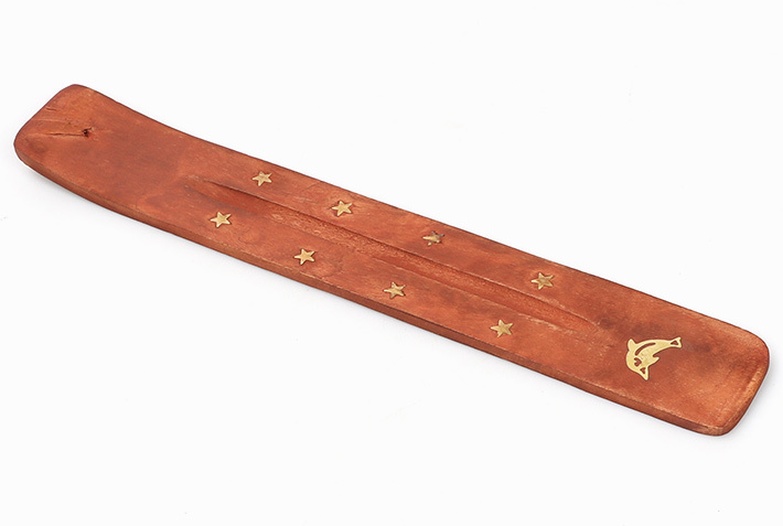 Klasyczna, drewniana podstawka na kadzidełka w formie patyczków. Posiada ozdobny, metalowy element w kształcie delfina.