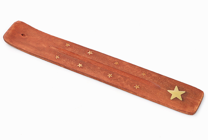Klasyczna, drewniana podstawka na kadzidełka w formie patyczków. Posiada ozdobny, metalowy element w kształcie gwiazdy.
