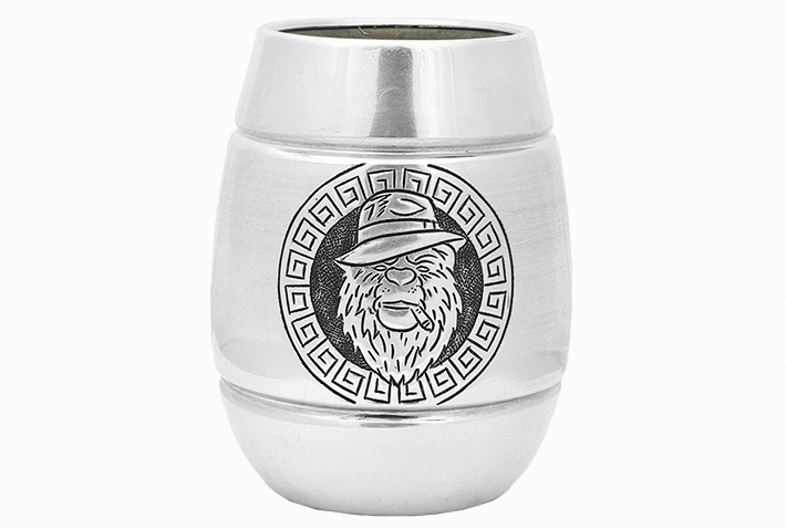 Unikatowe naczynie dla prawdziwego konesera Yerba Mate. Wykonane z pachnącego drewna Palo Santo z Paragwaju. Zdobienia wykonano ręcznie w polskiej pracowni. Charakterystyczny grawer przedstawia stylową podobiznę niedźwiedzia w kapeluszu z cygarem w paszczy. Grawer wykonany jest z dbałością o detale. Całość obrazu zamknięta została w geometrycznej ramie.