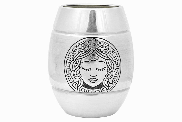 Unikatowe naczynie dla prawdziwego konesera Yerba Mate. Wykonane z pachnącego drewna Palo Santo z Paragwaju. Zdobienia wykonano ręcznie w polskiej pracowni. Charakterystyczny grawer przedstawia zamyśloną kobietę z zamkniętymi oczami, ozdobioną delikatną koroną z kwiatów. Całość obrazu otoczona została geometryczną ramą. Grawer wykonany jest ze szczególną dbałością o detale.