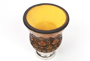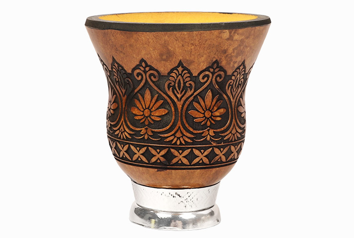 na metalowej, ozdobnej nóżce. Cuia posiada szeroki, starannie wygładzony kołnierz, który pozwala na usypanie z suszu charakterystycznego kopczyka.