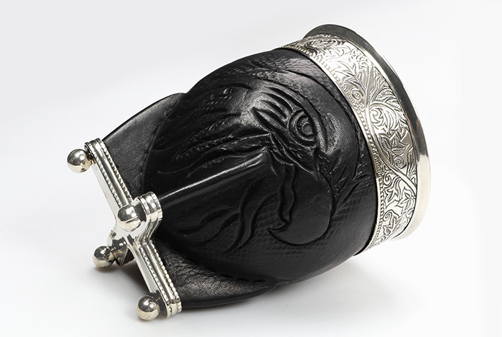 Na spodzie naczynie posiada dodatkowe okucie (tzw. baza), idealnie dopasowane do skórzanej podstawki. Baza również wykonana została z alpaki. Naczynie stabilnie stoi na 4 kulach.