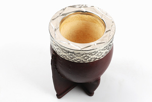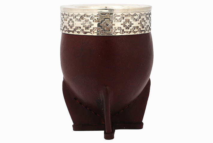 Unikatowe naczynie wytworzone w Urugwaju z dużego egzemplarza owocu tykwy o grubych ściankach. Całość obita naturalną skórą w ciemno-bordowym kolorze. Okucie u góry (virola) z wysokiej jakości alpaki, bogato grawerowana w geometryczne wzory oraz dekor na górnej krawędzi, nadaje naczyniu dostojny, szlachetny charakter.