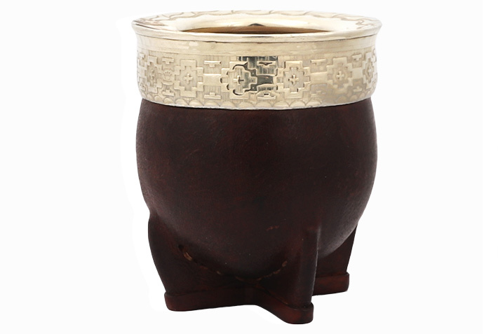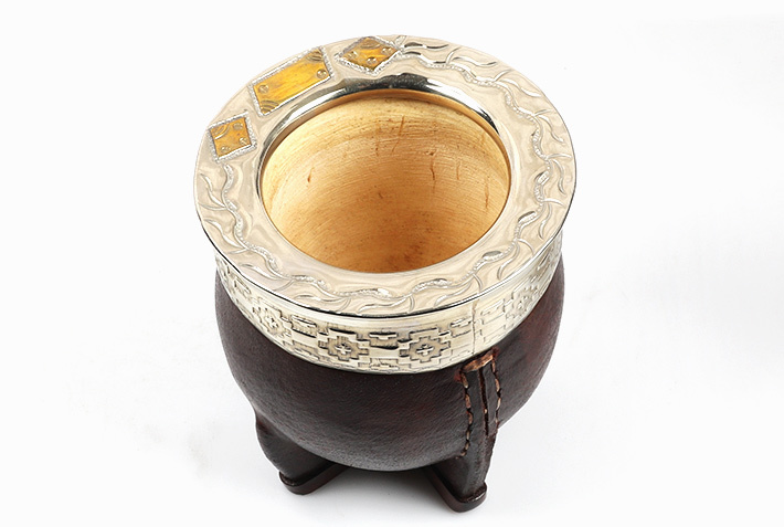 Unikatowe naczynie wytworzone w Urugwaju z dużego egzemplarza owocu tykwy o grubych ściankach. Całość obita naturalną skórą w ciemno-kasztanowym kolorze. Okucie u góry (virola) z wysokiej jakości alpaki, bogato grawerowana w geometryczne wzory oraz dekor na górnej krawędzi, nadaje naczyniu dostojny, szlachetny charakter.