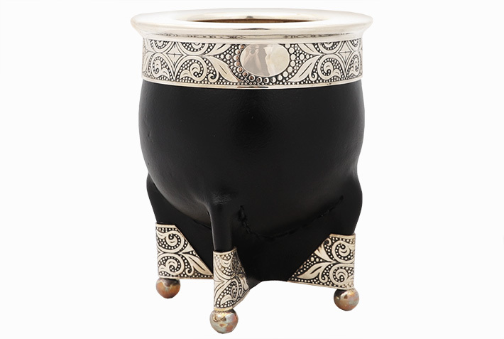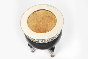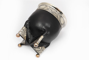 Unikatowe naczynie, ręcznie wykonane w Argentynie przez urugwajskich artystów, z dużego egzemplarza owocu tykwy o grubych ściankach. Całość oprawiona w naturalną skórę w ciemnobrązowym kolorze. Okucie u góry (wirola) jest ręcznie rzeźbione; wykonane w całości z alpaki (tzw. nowe srebro).