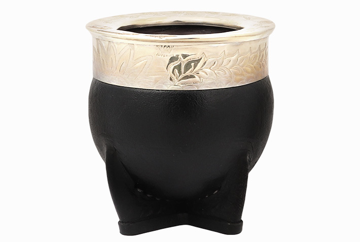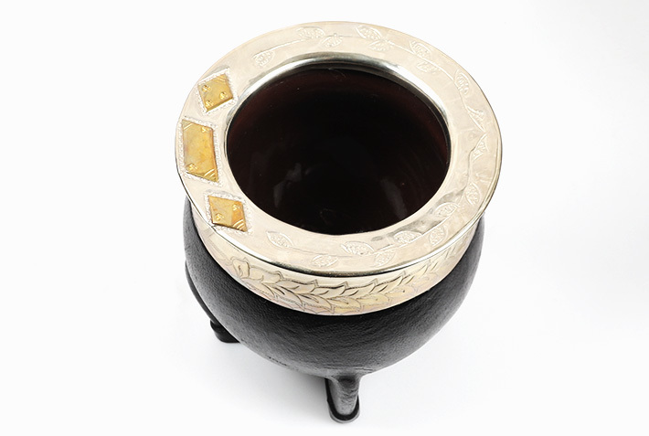 Urugwajskie, ręcznie wykonane naczynie z ceramiki, obite naturalną skórą w czarnym kolorze i wyposażone w grube ścianki. Stabilność zapewnia solidny, trójnożny stojaczek również obszyty skórą.