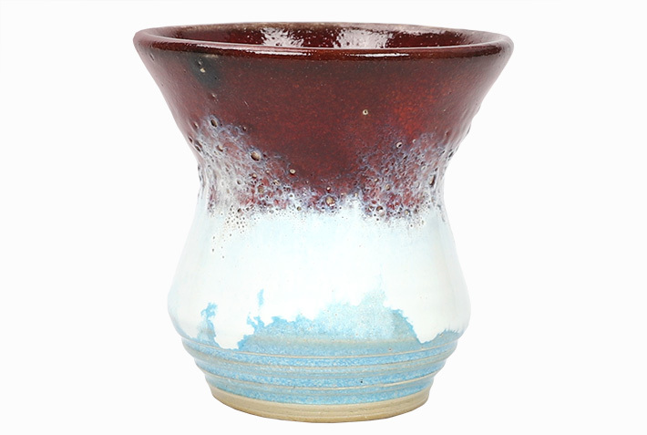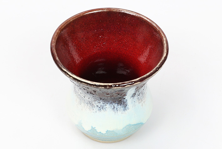 Szkliwo jest fantazyjne i kontrastowe – głęboka, winna czerwień przechodzi w chłodne biele i błękity, tworząc efekt jak spotkanie zachodzącego słońca z morską pianą. Góra naczynia ma intensywny, ciemnoczerwony połysk, natomiast dół zdobi jasne szkliwo z delikatnymi, niebieskimi smugami, które nadają mu oceanicznego charakteru.