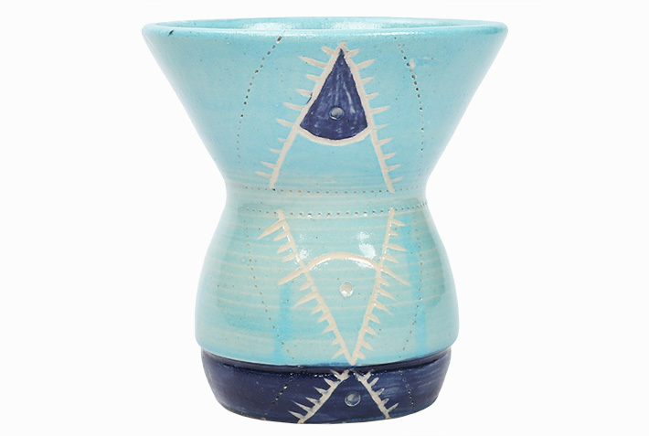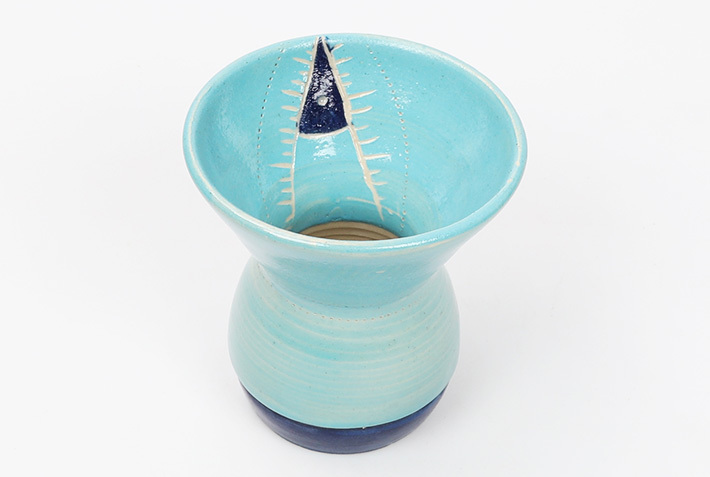 Szkliwo jest jednolite i utrzymane w przyjemnej palecie błękitów – jasny turkus przechodzi w głębszy, granatowy ton u podstawy. Charakterystyczne, ręcznie ryte motywy przypominające ryby dodają naczyniu morskiego klimatu. Całość przywodzi na myśl czystą wodę, słońce i spokojny nadmorski krajobraz.