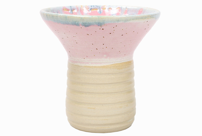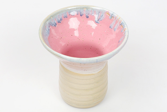 Szkliwo jest fantazyjne i wielobarwne – połączenie pastelowego różu z subtelnymi smugami błękitu tworzy efekt przypominający delikatny, poranny blask na niebie. Wnętrze naczynia wypełnia intensywny róż, który pięknie kontrastuje z naturalnym, piaskowym dołem, nadając całości wyjątkowo przyjemnego, słodkiego charakteru.