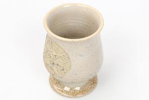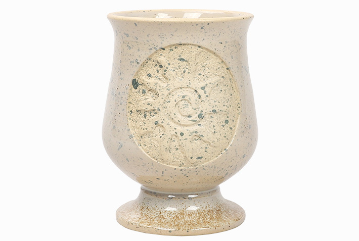 To rzemieślnicze mate wyróżnia się subtelnym, spiralnym motywem umieszczonym w centralnej części naczynia. Wzór przypomina słońce w ruchu, odciśnięte w surowej, lekko chropowatej fakturze, która pięknie kontrastuje z gładkim, szkliwionym tłem. Całość utrzymana jest w jasnych, kremowo-piaskowych odcieniach. Stabilna, szeroka stopka nadaje kielichowi lekkości wizualnej, a harmonijna kompozycja barw sprawia, że naczynie prezentuje się wyjątkowo elegancko i minimalistycznie.