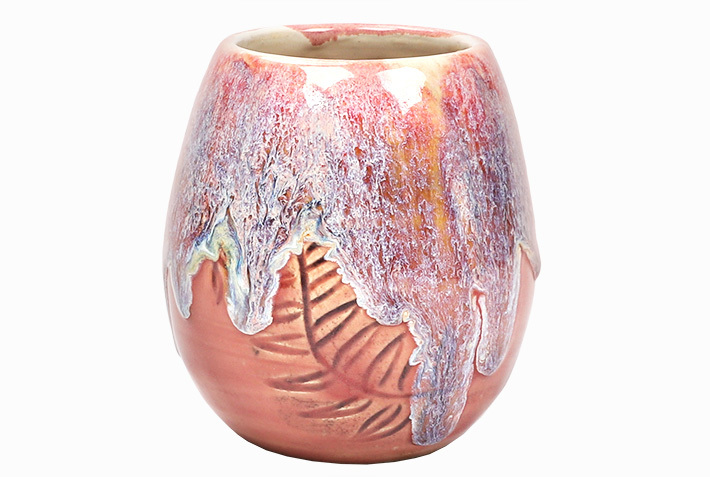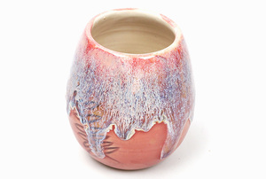 Fantazyjne naczynko o wyjątkowym, przyciągającym wzrok szkliwieniu. Naczynie jest idealnie gładkie, połyskujące, oblane przyjemnym dla oka szkliwieniem w kolorach różu, fioletu i błękitu. Przypomina truskawkowe lody oblane borówkowym sosem.