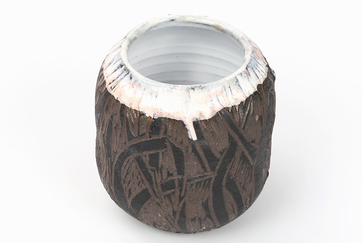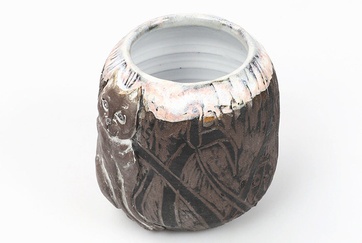 Masywne naczynko o surowym charakterze. Jego głęboka, ciemnobrązowa baza jest ozdobiona imponującym wizerunkiem kota, który spogląda w dal. Biało-różane detale w górnej części naczynka dodają kontrastu i głębi, podkreślając artystyczną duszę tego przedmiotu. Całość designu niesie ze sobą aurę fantazji i magii przyrody.