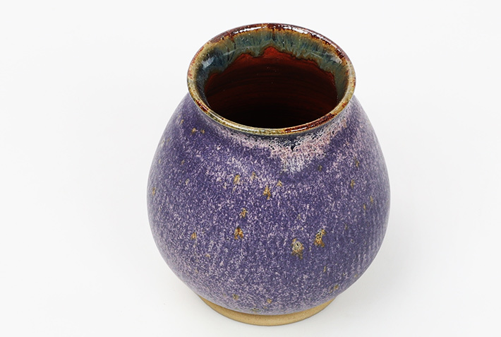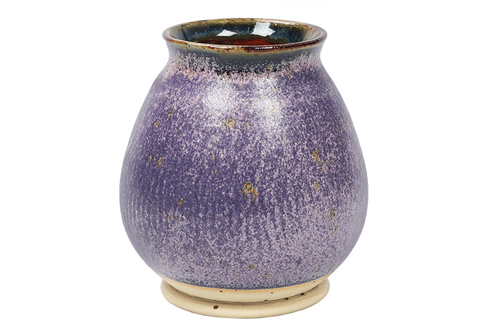 Naczynko urzeka radosnym, fioletowym kolorem bajkowego nieba. Zdobione jest delikatnym, falistym wzorem, a na powierzchni widać subtelne, złote akcenty, które przypominają migotanie gwiazd. Górna krawędź naczynia wykończona jest elegancką cienką linią w burgundowym odcieniu, a dolna część utrzymana w naturalnym, kremowym tonie gliny. Całość tworzy harmonijną kompozycję, która zachwyca zarówno formą, jak i kolorem.