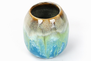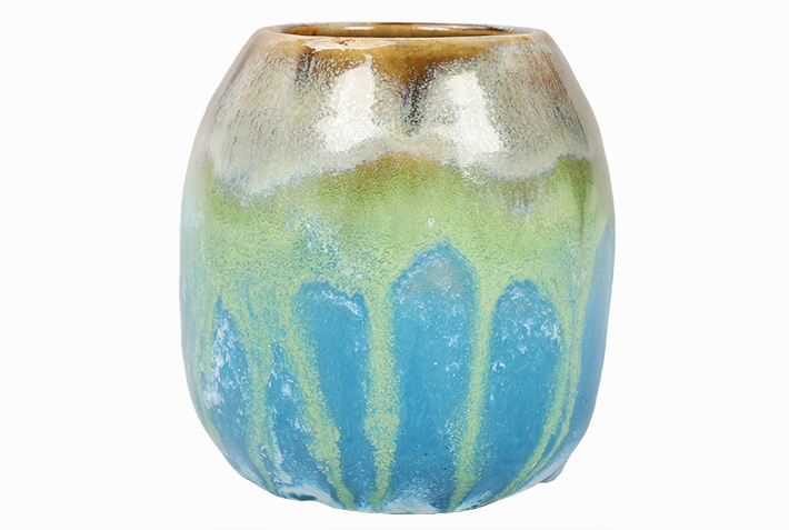 To ceramiczne naczynie charakteryzuje się fantazyjną, wielobarwną glazurą o radosnych, wiosennych barwach. Powierzchnia jest gładka i lśniąca, z subtelnymi nieregularnościami typowymi dla ręcznie robionych przedmiotów.