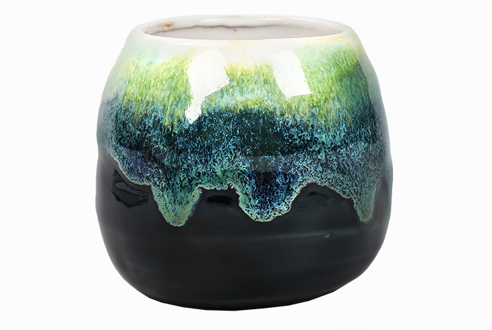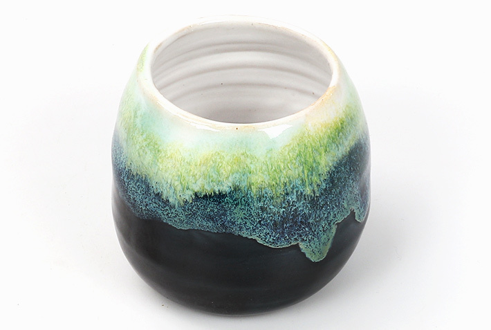 Kolorystyka tego naczynka jest bardzo charakterystyczna i podzielona na dwie główne strefy. Dolna połowa naczynia jest w głębokim, ciemnogranatowym kolorze. Górna część prezentuje piękne przejście kolorystyczne od intensywnego turkusu przez szmaragdową zieleń do jasnozielonego odcienia na samej górze.