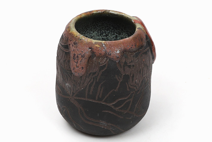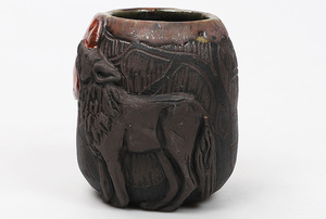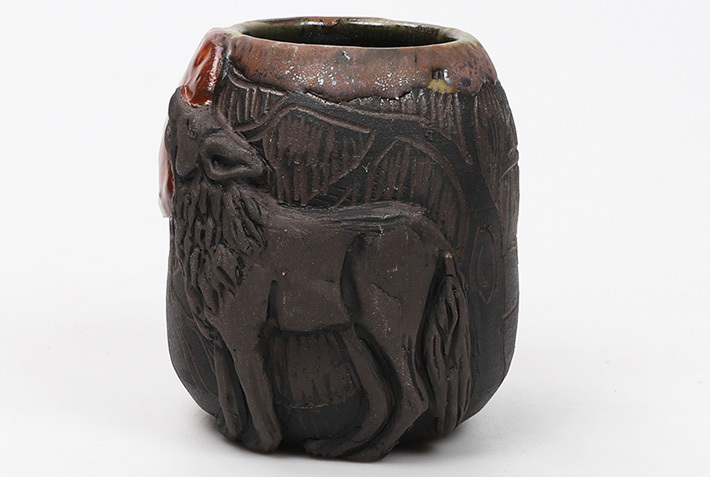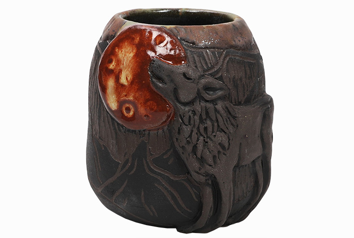 Masywne naczynko o surowym i dzikim charakterze. Jego głęboka, ciemnobrązowa baza jest ozdobiona imponującym wizerunkiem wilka, który z majestatem i siłą spogląda z centrum naczynka. Złoto-brązowe detale w górnej części naczynka dodają kontrastu i głębi, podkreślając dziką naturę przedstawionego wilka. Całość designu niesie ze sobą aurę tajemniczości i dzikości.