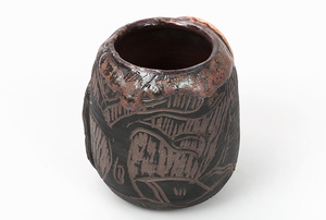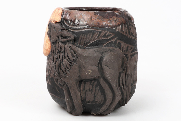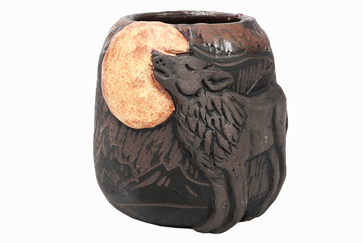 Masywne naczynko o surowym i dzikim charakterze. Jego głęboka, ciemnobrązowa baza jest ozdobiona imponującym wizerunkiem wilka, który z majestatem i siłą spogląda z centrum naczynka. Złoto-brązowe detale w górnej części naczynka dodają kontrastu i głębi, podkreślając dziką naturę przedstawionego wilka. Całość designu niesie ze sobą aurę tajemniczości i dzikości.