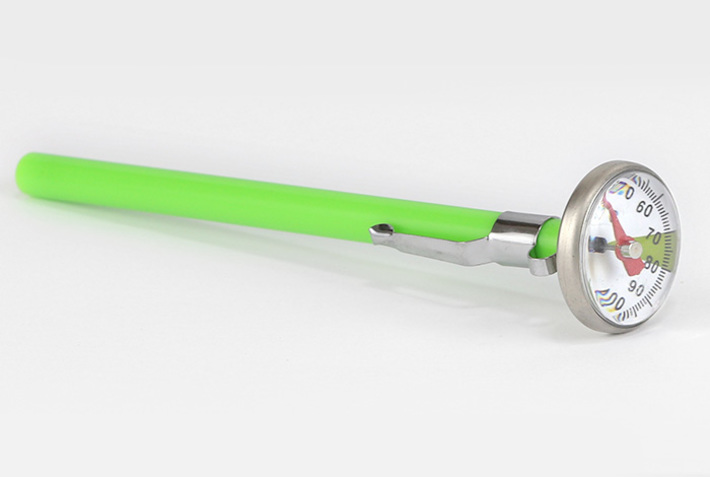 Zielony termometr z uśmiechniętą tykwą Dobrego Ziela na tarczy oraz zaznaczonym na zielono zakresem temperatur idealnych do przygotowania pysznej Yerba Mate.