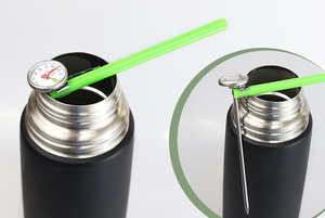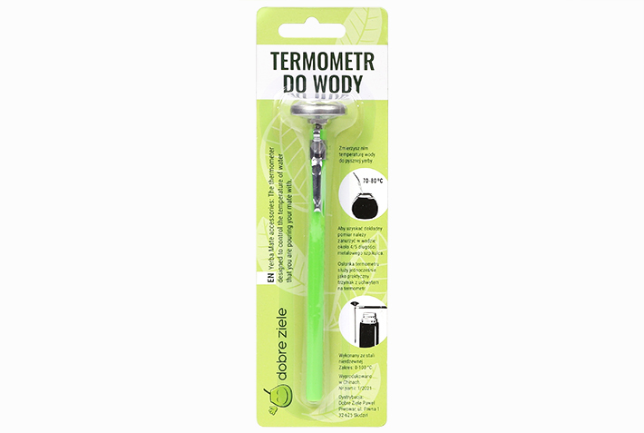 Termometr pozwala na wygodne zmierzenie temperatury wody. Osłonka termometru służy jednocześnie jako praktyczny trzymak z uchwytem (mały, metalowy otwór) na termometr. Dzięki niemu, nie poparzysz się mierząc temperaturę nad gorącymi płynami. I nie musisz już się obawiać, że termometr wpadnie do termosu z wodą do yerby!