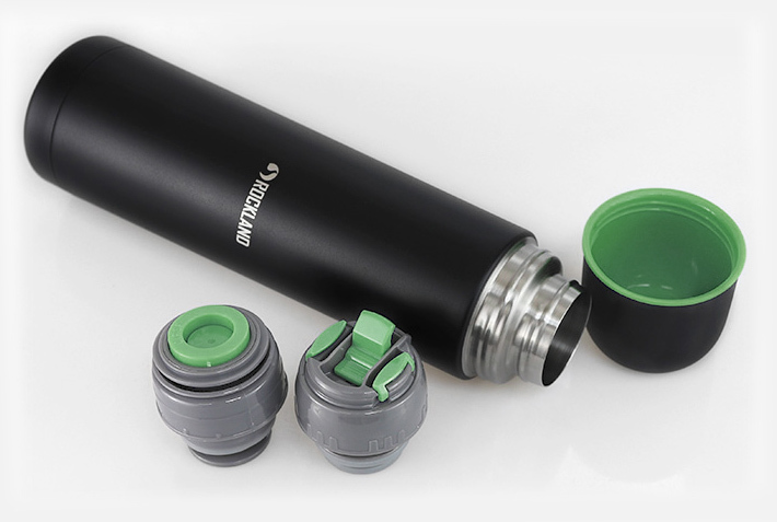 Bardzo dobrze wykonany termos outdoor`owy marki Rockland. Korpus wykonany ze stali nierdzewnej posiada podwójną ściankę wypełnioną próżnią. Z zewnątrz pokryty czarną powłoka malowaną proszkowo, o lekko chropowatej fakturze. Daje to pewny chwyt, nawet w trudnych warunkach, przy mokrych rękach.