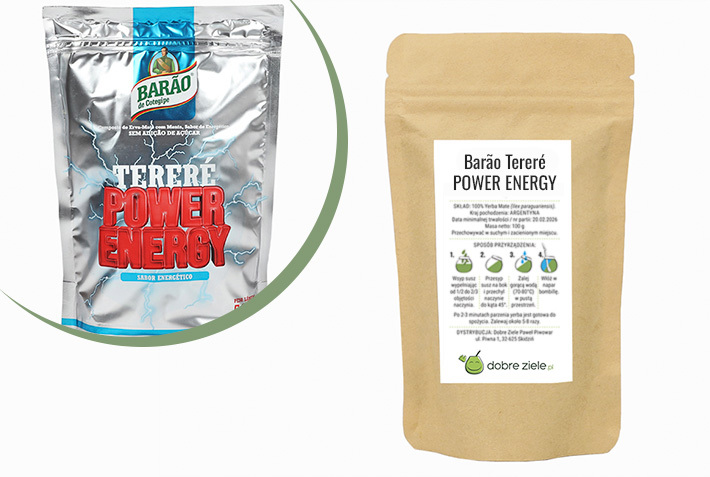 Barão Tereré POWER ENERGY to grubocięta, mało pylasta erva mate o intensywnym smaku dodatków: liści mięty oraz aromatu energy drink.Jest to doskonałą pozycja dla dla fanów smaku napojów energetycznych, którzy chcą zmniejszyć ilości spożywanej kofeiny. Delikatna, przyjemna z charakterystycznymi nutami dodającymi skrzydeł, a także z odświeżającą miętą.